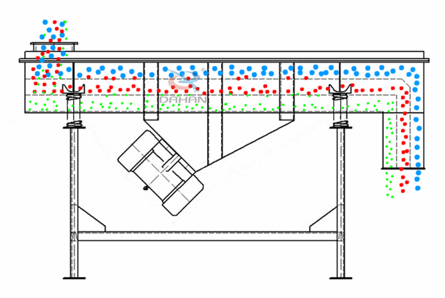 原理是利用振動(dòng)電機(jī)激振器作為振動(dòng)源,使物料在篩網(wǎng)上被拋起,同時(shí)向前作直線運(yùn)動(dòng),物料從給料機(jī)均勻地進(jìn)入篩分機(jī)的進(jìn)料口,通過多層篩網(wǎng)產(chǎn)生數(shù)種規(guī)格的篩上物、篩下物、分別從各自的出口排出。