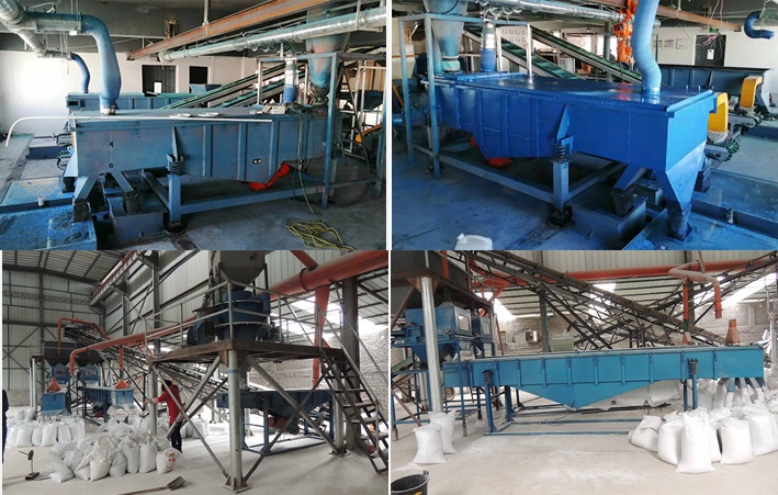 塑料顆粒通過輸送帶進入多層直線篩設備,由于電機激振力和自身重力的雙重作用,塑料顆粒沿直線篩面直線跳躍,上層塑料顆粒在上排料口被篩出,而小于篩網目數的塑料顆粒進入下部篩網,仍沿同一物料運動軌跡。經過三層篩網后,塑料顆粒分為大于2.5mm塑料顆粒、2.5mm-1.4mm塑料顆粒、1.4mm-80目塑料顆粒、小于80目塑料顆粒等四種規(guī)格的材料,還可根據要求選擇6層不通目數的篩網,以實現要求的分級效果。
