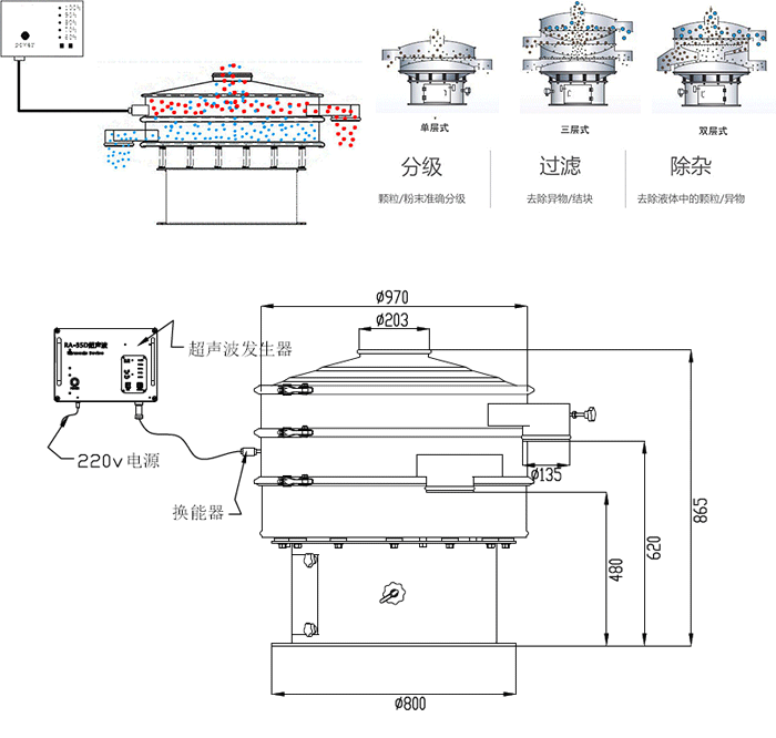 大漢振動篩廠家研發(fā)的超聲波振動篩解決強吸附性、易團聚、高靜電、高精細、高密度、輕比重等篩分難題,具有優(yōu)越的性能!在超聲波振動篩的性能上實現(xiàn)大的突破。篩分精度可提高1-100%,產(chǎn)量可提高1-10倍;真正滿足500目以上工業(yè)化生產(chǎn)需要。